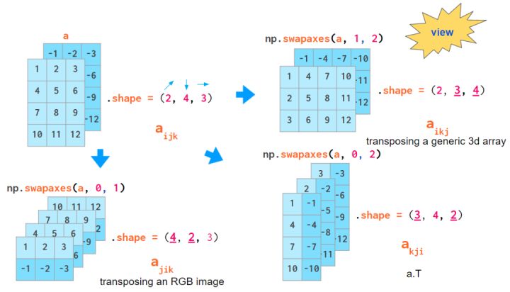 根据我们决定的axis顺序,转置数组所有平面的实际命令将有所不同:对于通用数组,它交换索引1和2,对于RGB图像,它交换0和1: