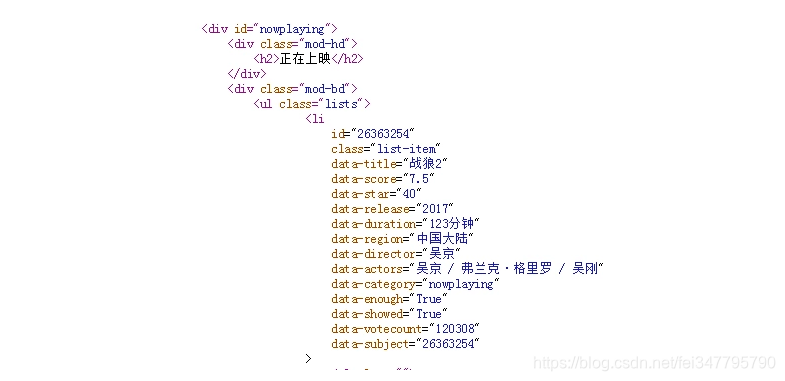 从上图中可以看出在div id="nowplaying"标签开始是我们想要的数据,里面有电影的名称、评分、主演等信息。所以相应的代码编写如下: