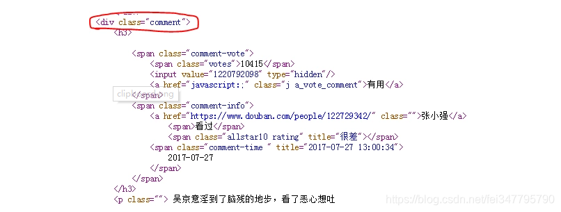 此时在comment_div_lits 列表中存放的就是div标签和comment属性下面的html代码了。在上图中还可以发现在p标签下面存放了网友对电影的评论,如下图所示: