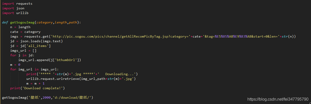 http://pic.sogou.com/pics/channel/getAllRecomPicByTag.jsp?category=%E5%A3%81%E7%BA%B8&tag=%E5%85%A8%E9%83%A8&start=0&len=15&width=1536&height=864,试着去掉一些不必要的部分,技巧就是,删掉可能的部分之后,访问不受影响。经笔者筛选。最后得到的url:http://pic.sogou.com/pics/channel/getAllRecomPicByTag.jsp?category=%E5%A3%81%E7%BA%B8&tag=%E5%85%A8%E9%83%A8&start=0&len=15 字面意思,知道category后面可能为分类。start为开始下标,len为长度,也即图片的数量。好了,开始愉快的代码时间吧: