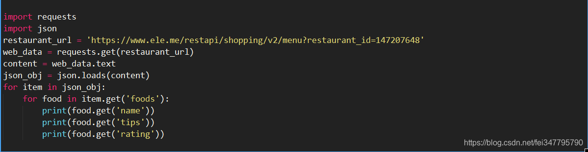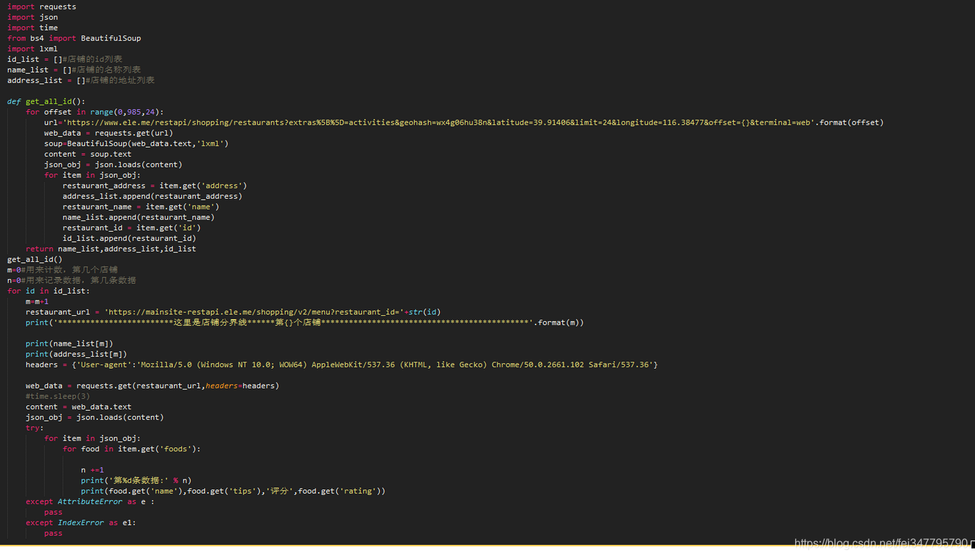 4.我们的目的是爬取中南海附近所有的外卖信息,这样一个个爬取肯定是浪费时间的,返回到上一页,我们再随便打开几个店铺,发现几个url只有后面一串数字不同,观察之后发现这就是店铺的id,因此我们只需要获取所有店铺的id就可以获取所有店铺的外卖信息了。爬取id的过程其实和上一个页面差不多,都是通过抓包完成的,这里不多做解释。直接上完整代码