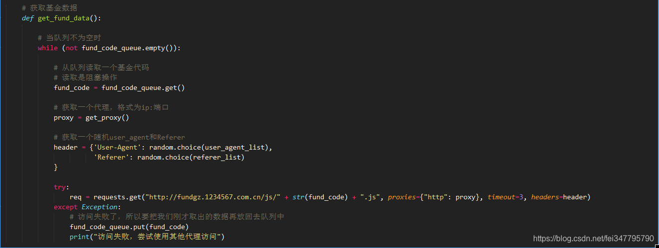 现在,开始编写如何获取指定基金的代码。首先,该函数必须先判断queue是否为空,当不为空的时候才可进行获取基金数据。同时,当发现访问失败时,则必须将我们刚刚取出的基金代码重新放回到队列中去,这样才不会导致基金代码丢失。