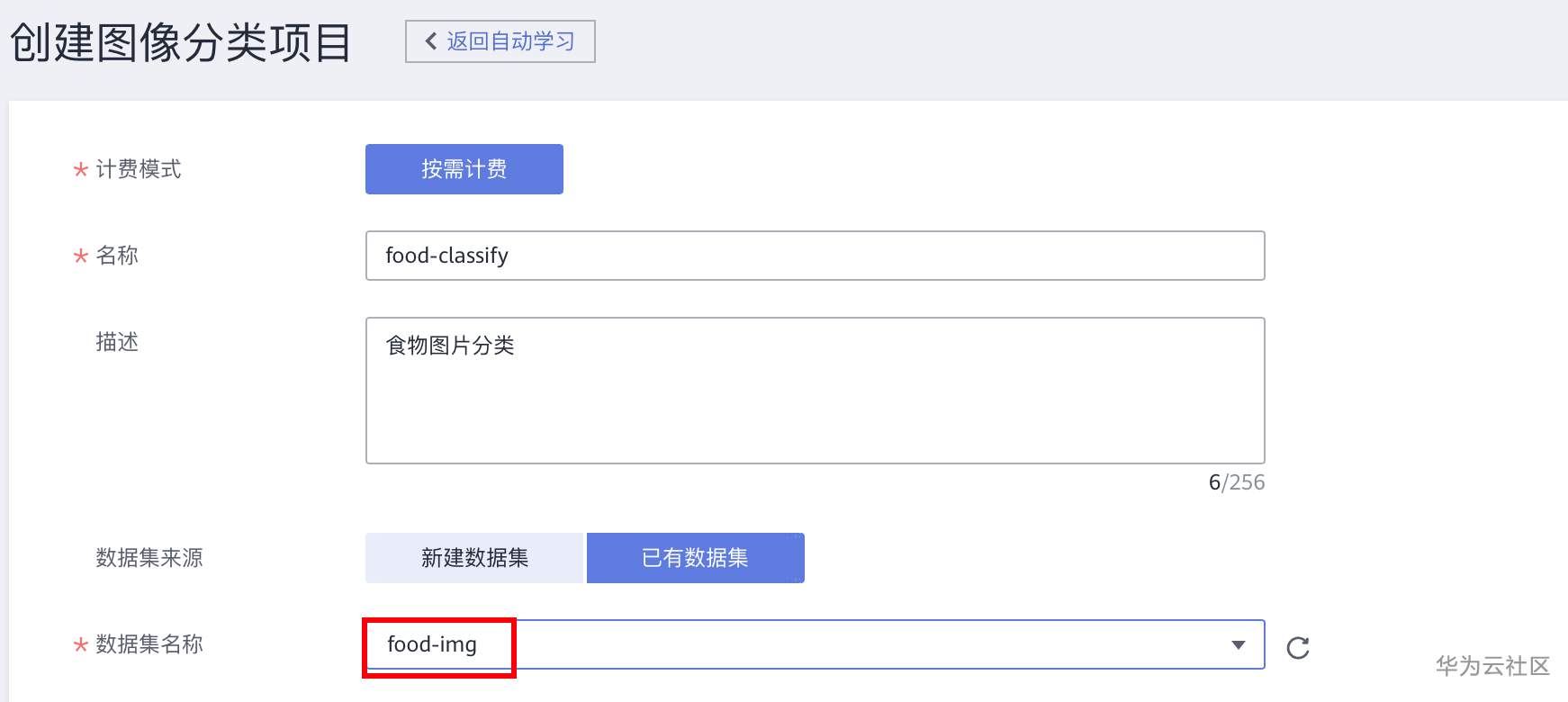 输入项目名称,数据集选择“已有数据集”,选择刚才创建的数据集