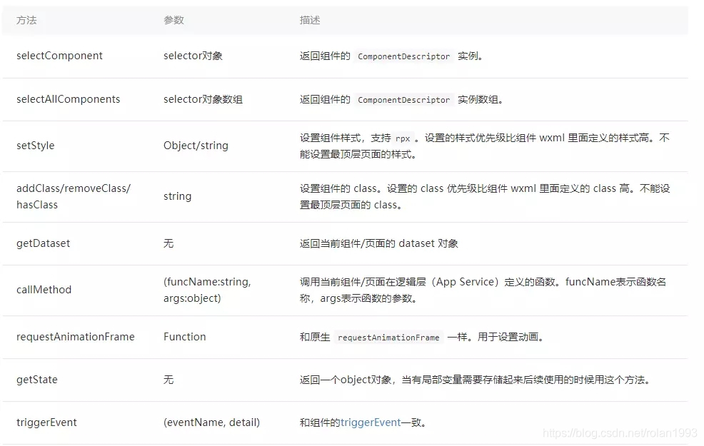 常用的就是获取组件(类似于获取dom节点),和设置样式和class,调用app service方法 除了以上方法,还有强大的触发器函数的使用,可监听appservice 层中的data变化,具体demo请查看官方文档 官方文档