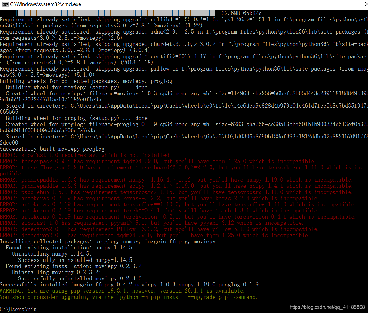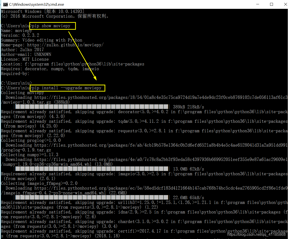 Python有些出色的数据可视化库,但很少能渲染GIF或视频动画。本文介绍如何运用MoviePy作为其他库的通用动画插件。 有了 MoviePy ,你可以用一个函数 make_frame(t) 自定义动画,并返回相应的时间t的视频帧(秒)。通过moviepy的官网看到依赖的库有Numpy,imageio, Decorator, and tqdm,而我的anaconda3安装时缺少tqdm(使用conda list能看到)