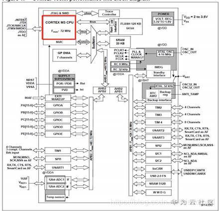 红框为ARM内核也就是arm公司设计的,其余部分都是st公司二次开发设计出来的,最终被封装到一个黑色的小盒子内并引出引脚供我们使用。常见的内核外部外设有定时器、GPIO控制器、串口等等,如果我们需要了解此类设备就需要查阅st公司提供的参考手册,例如《STM32F103参考手册》。