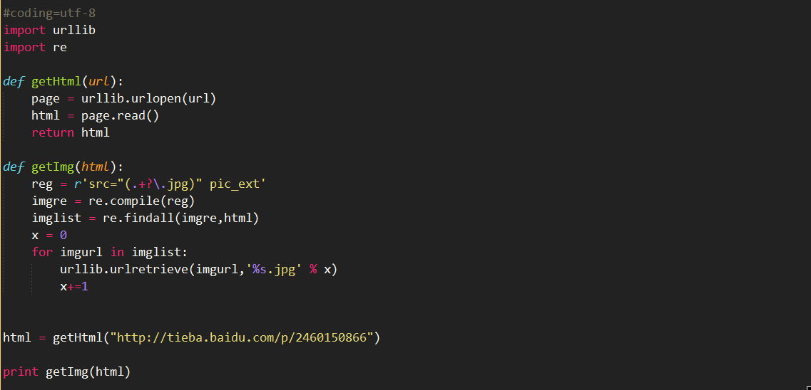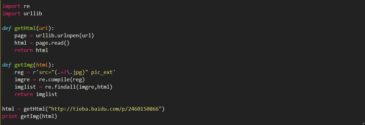 我们又创建了getImg()函数,用于在获取的整个页面中筛选需要的图片连接。re模块主要包含了正则表达式: