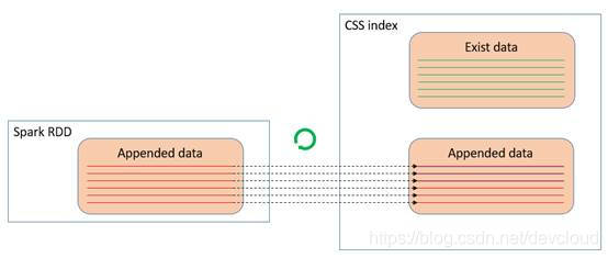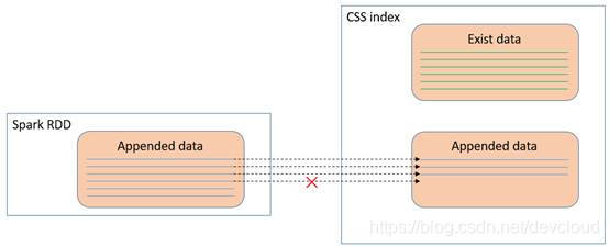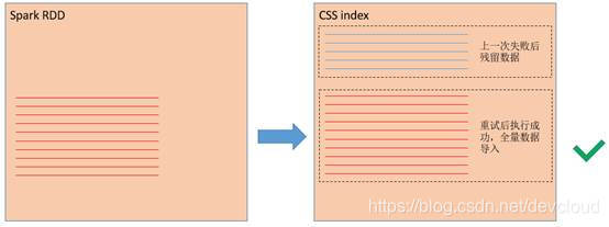 我们举一个简单的例子来说明一下,图1在SparkRDD中(这里假设是一个task),每一条蓝色的线代表100万条数据,那么10条蓝色的线表示了有1000万条数据准备写入到CSS(华为云搜索服务,内部为es)的某个index中。在写入过程中,系统发生了故障,导致只有一半(500万条)数据成功写入。