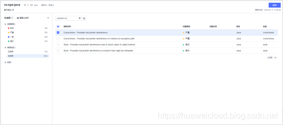 通常情况下,使用华为云DevCloud进行代码检查非常简单:新建代码检查任务然后执行此任务即可。当前前提是默认的规则集“通用检查规则集”满足代码质量的要求。用户可以在任务的“设置”-“规则集”中选择系统内置的其它规则集(例如“全面检查规则集”)或者自定义的规则集。接下来,我们通过自定义规则集的方式来进行NPE问题的检查。