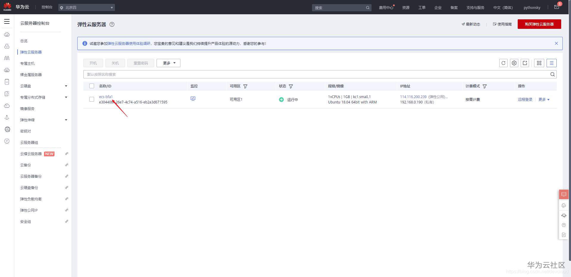 首先修改一下安全组,点击控制台-弹性云服务器,点击实例名字