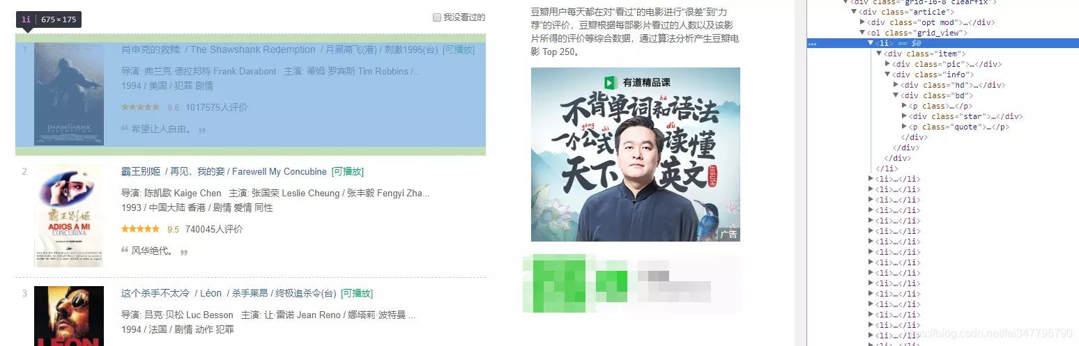 打开F12/右键检查第一个电影,分析源码先,发现每个<li>标签就对应着一个电影的信息。