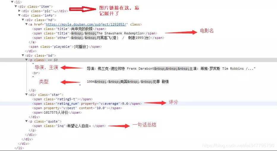我们来爬取每部电影的图片,名称,导演演员,类型,评分,和它的一句话总结,继续对<li>标签进行分析,又发现信息又在<div class="info">标签里,而这标签只存在于<li>标签中,其它地方不存在,这样可以用find_all()方法把他们全部分离出来。这里不选择<li>标签是它没有唯一性,电影以外的内容也有<li>标签。