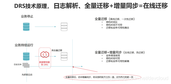 华为云数据库基于“做最懂客户迁移难题的产品”的理念,推出华为云数据库复制服务DRS。如果将数据库比喻成“城市”,我们可以理解DRS便是城市之间的“地底光纤”,确保将“始发地”源库的数据安全、快速、高效地运输到“目的地”目标库,可达到百公里内毫秒级别、远距离情况下秒级的传输速度。为了保障数据库迁移过程中数据的一致性,一种方式是需要停掉业务,进行一次性迁移(也称离线迁移),这就造成了数据量越大,迁移时间越长,也就意味着停机时间越久。那么是否有一种方式既能保障数据库迁移过程中数据的一致性,又能做到业务持续运行?这就对DRS提出了更高的要求。DRS通过全量迁移+增量同步的方式(也称在线迁移),在全量迁移完成后,启动增量同步过程。增量同步是将源库先进行日志解析,日志可以很形象的看成是“录像带”,记录了源库的所有操作,我们将日志“回放”出来,源库做了什么数据操作,目标库就做什么样的操作,最终这部分增量数据被并行复制到目标库,来保证数据的一致性。整个过程可以理解为在业务运行的过程中,潜移默化地完成了源库与目标库之间的数据迁移,业务无感知。