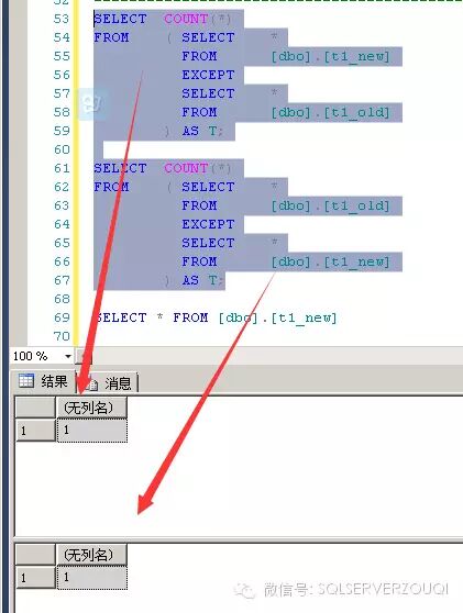 SELECT COUNT(*)FROM ( SELECT * FROM [dbo].[t1_new] EXCEPT SELECT * FROM [dbo].[t1_old] ) AS T;SELECT COUNT(*)FROM ( SELECT * FROM [dbo].[t1_old] EXCEPT SELECT * FROM [dbo].[t1_new] ) AS T;SELECT * FROM [dbo].[t1_new]SELECT * FROM [dbo].[t1_old]