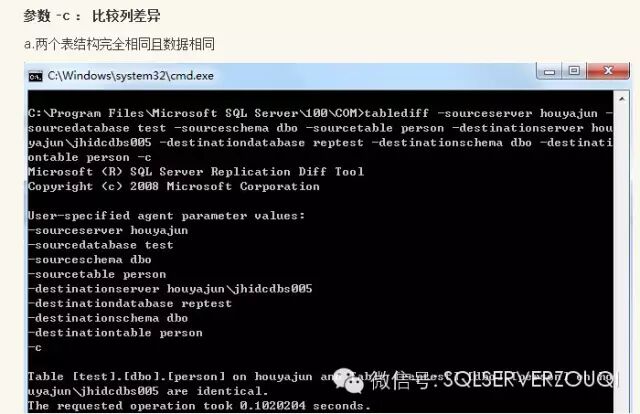 方法五:借助SQLSERVER自带的tablediff工具,当初微软制作这个工具的目的就是用于比较复制中发布表和订阅表的数据一致