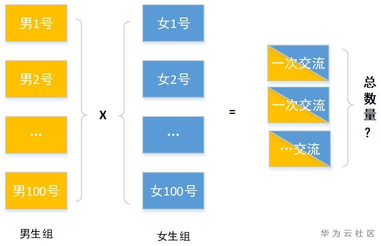 那么最常见的“交流环节”当然就是两两交流啦。每个人和任意一位异性交流一次,这样一共需要进行 100 * 100 = 10000 场的对话交流。即 N * M 次交流,我们称 笛卡尔式。