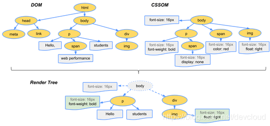 当然把DOM树和样式规则树匹配构建渲染树时,只会把可见元素和它对应的样式规则结合一起产出到渲染树,这就意味有不可见元素,当匹配DOM树和样式规则树时,若发现一个元素的对应的样式规则上有display:none,浏览器会认为该元素是不可见的,因此不会把该元素产出到渲染树上。