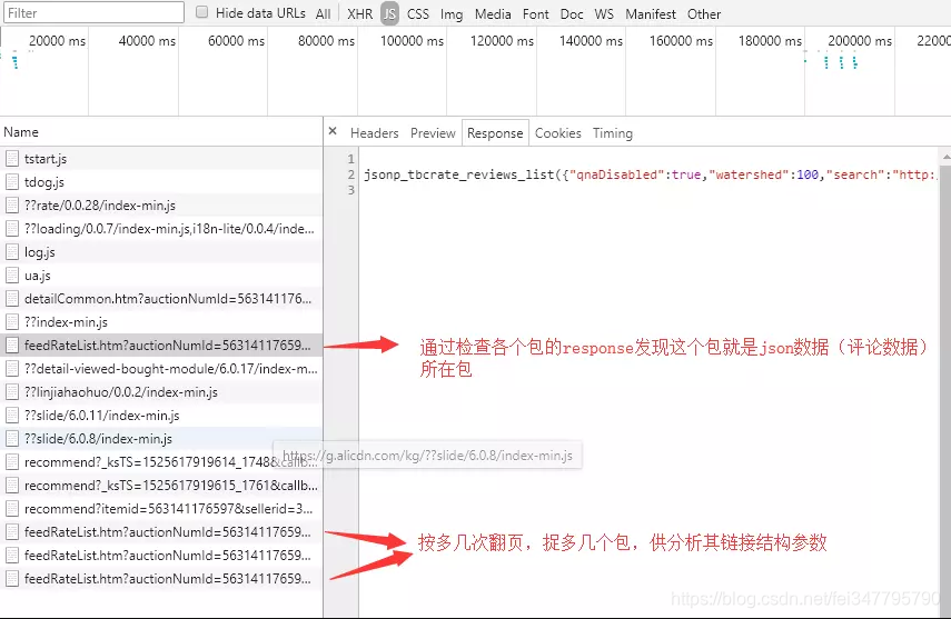 继续以某宝为例吧,随便搜一个商品进去,或者点我这个示例商品链接。打开F12,换到Network捉js的包,点到评论那里,很快就弹出很多个包,逐个查看其response,很快就确定了目标包,然后评论换页,捉多几个供链接分析用。
