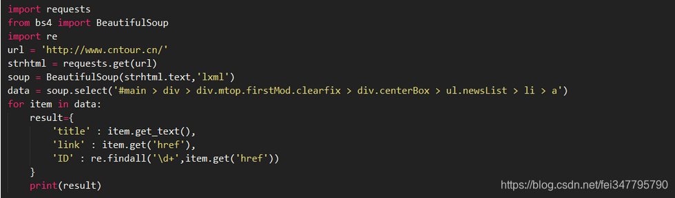 Data=soup.select(‘[#main > div > div.mtop.firstMod.clearfix > div.centerBox > ul.newsList > li > a’)