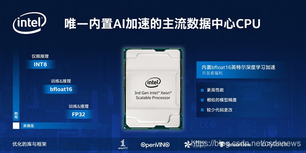 - 全新第三代英特尔®至强®可扩展处理器:英特尔在全新第三代至强®可扩展处理器中继续加大其在内置AI加速方面的投入,将bfloat16支持整合到其独有的深度学习加速技术当中。bfloat16是一个精简的数据格式,与如今的32位浮点数(FP32)相比,bfloat16只通过一半的比特数且仅需对软件做出很小程度的修改(如必要),就可达到与FP32同等水平的模型精度。新增的bfloat16支持同时为CPU的AI训练和推理性能提供加速。英特尔针对领先的深度学习框架(包括TensorFlow和Pytorch)优化过的版本将支持bfloat16,并通过英特尔AI分析工具包即可获得。英特尔同时为OpenVINO工具包和ONNX Runtime环境提供bfloat16优化,以简化推理的部署工作。第三代英特尔®至强®可扩展处理器(代号“Cooper Lake”)是英特尔面向四路、八路处理器市场的产品。这一处理器专为深度学习、虚拟机(VM)密度、内存数据库、任务关键型应用及分析密集型工作负载而设计。对于那些将老旧基础设施进行更新换代的客户来说,与使用寿命已达5年的同等级四路平台相比,其有望在常见工作负载3上获得预计约1.9倍的提升和高达2.2倍的虚拟机提升。