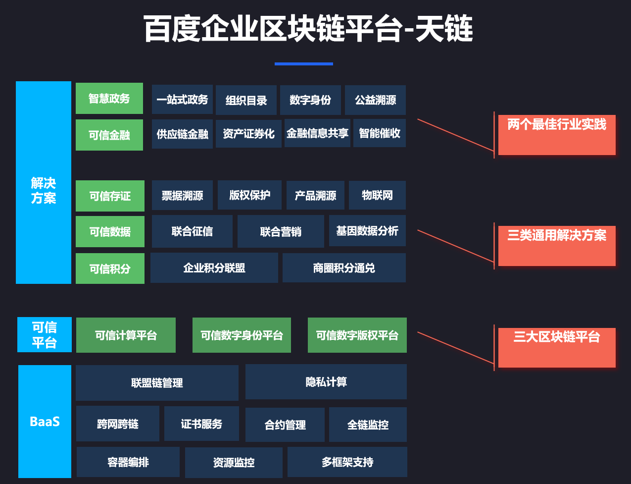 - 天链平台在BaaS服务基础之上提供了Web3.0时代的可信平台能力。我们认为区块链将是Web3.0时代的可信任协议层,在此协议层之上可进行跨多方的数据、身份、版权等生产要素的可信流通,百度天链提供了全面的解决方案能力。可信计算平台是跨多方的隐私、安全、公平、可追溯的数据联合隐私计算平台,在金融、政务、医疗等数据场景有很好的应用空间。可信数字身份是链上的去中心化身份系统,它提供了联盟化的用户身份管理机制,真正地保护用户的数据隐私、安全和权益,百度也推出了业界首个可信数字身份小程序,大家可以在百度搜索中直接输入“可信数字身份”来体验。数字版权基于用户的身份和数据来产生,包括文字、图片、音视频等内容,百度会通过链上版权保护技术,帮助保护用户的权益。