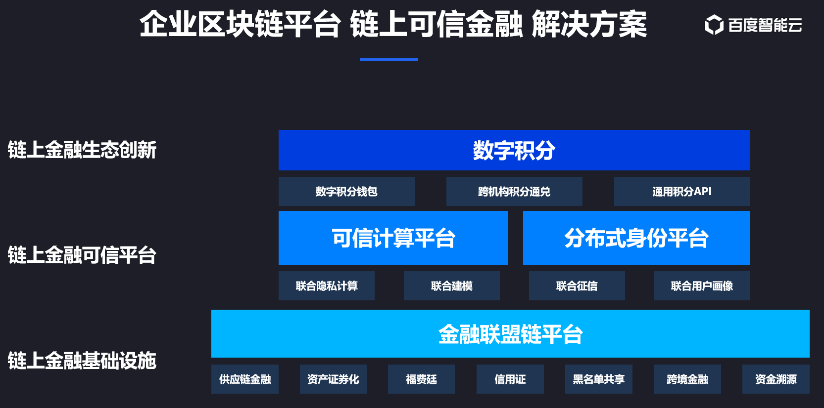 - 百度的可信金融方案中里,具备金融场景化的很多模板实现,包括供应链金融、资产证券化、金融信息共享、智能催收、数字积分等等。