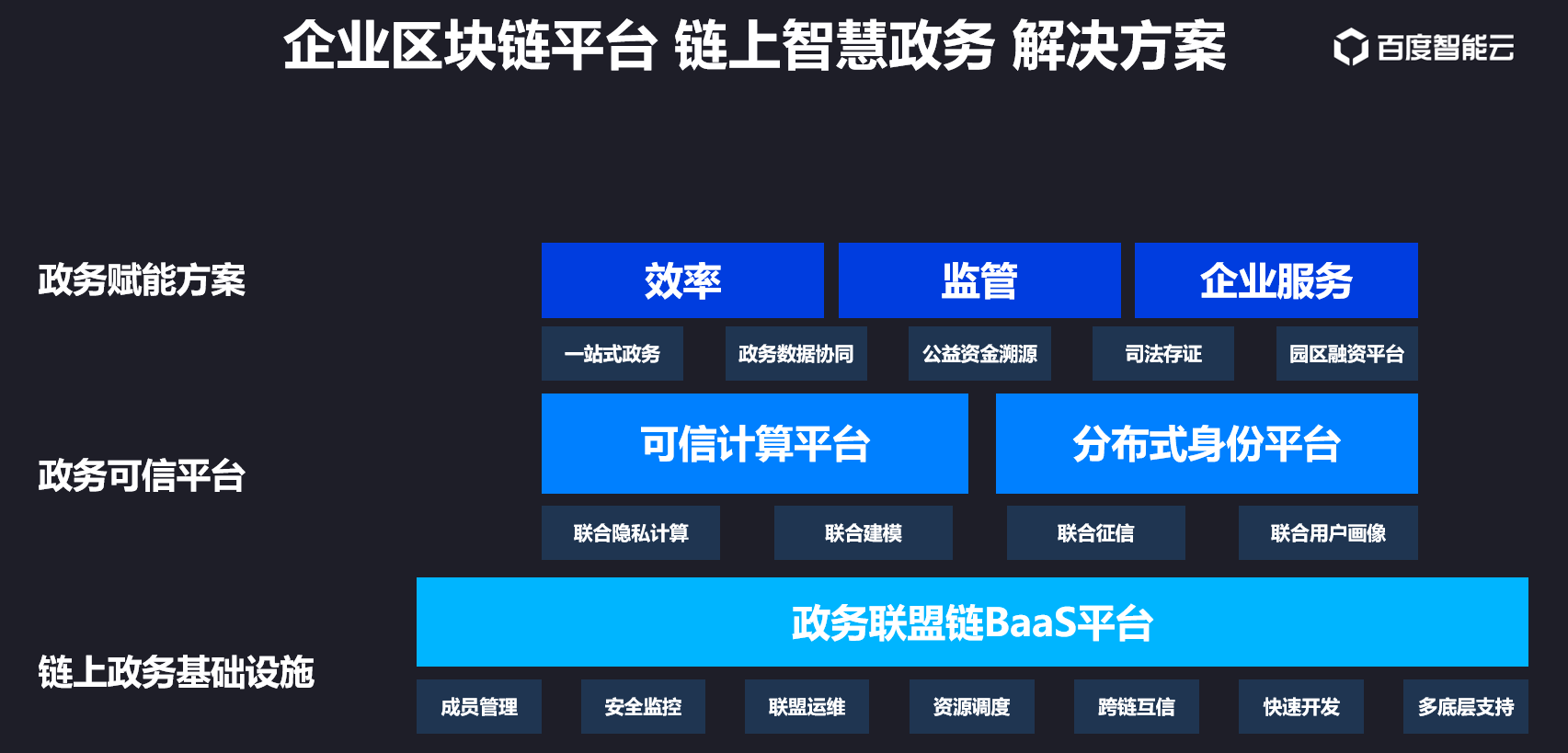 百度现在最主打的两个行业解决方案,分别是智慧政务和可信金融解决方案,这也是目前区块链落地最多的行业。