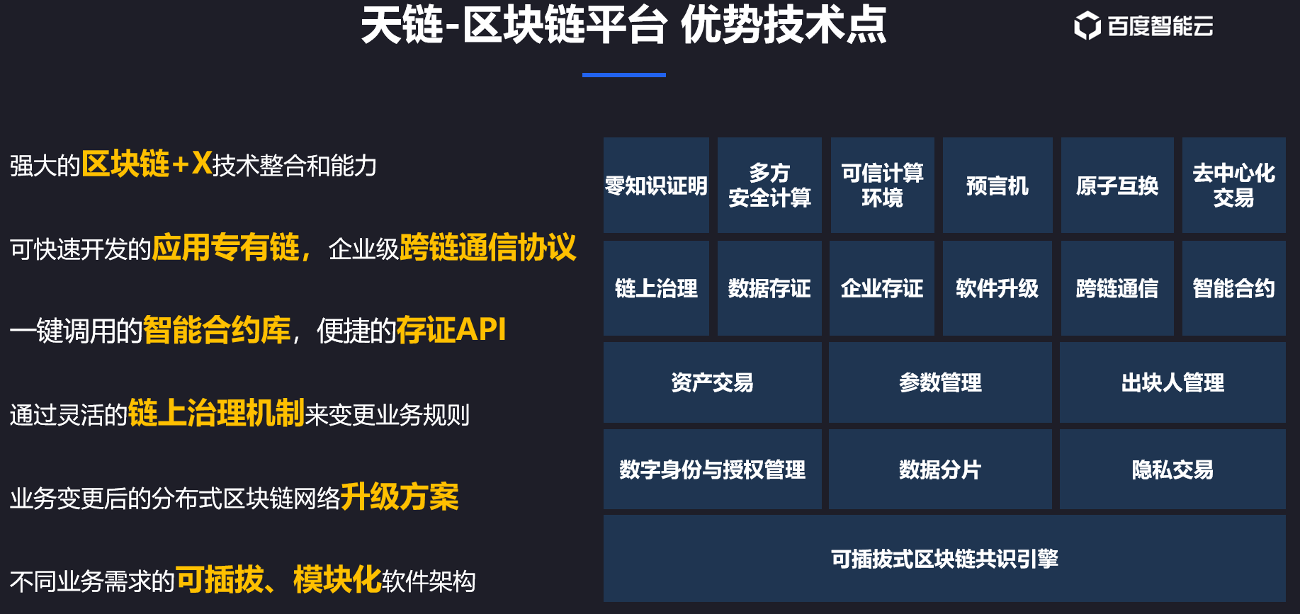 百度还会提供可插拔的模块化区块链软件架构,用户可以分层、分级地使用,有了这些技术点,才能真正地把专业技术,跟企业业务平台做整合,发挥出价值。