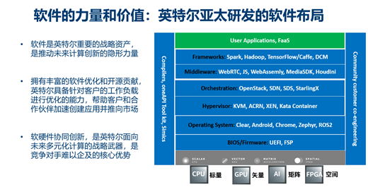 而这也可以从英特尔亚太研发的软件布局中可见一斑。无论是在 CPU、GPU、AI、FPGA 等硬件基础上,还是在BIOS 和 Firmware、操作系统、虚拟化技术、Orchestration、Middleware、Framework 等层面,英特尔在软件领域的探索超乎外界想象。