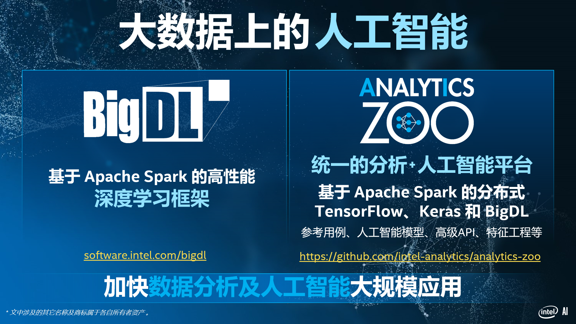 - Analytics Zoo(https://github.com/intel-analytics/analytics-zoo),该项目进一步为大数据用户提供了一个统一的端到端的大数据分析+深度学习的平台。这个平台构建于 BigDL、TensorFlow 等引擎之上,可以在 Spark 平台上为多种深度学习框架提供分布式支持,并且提供了很多预训练和预定义的模型以及参考案例,使得用户构建应用更容易也更高效。