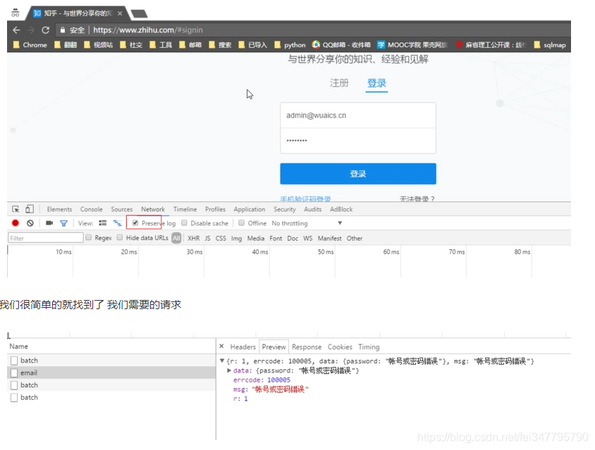 注意打开开发者工具后点击“preserve log”,密码记得故意输入错误,然后点击登录