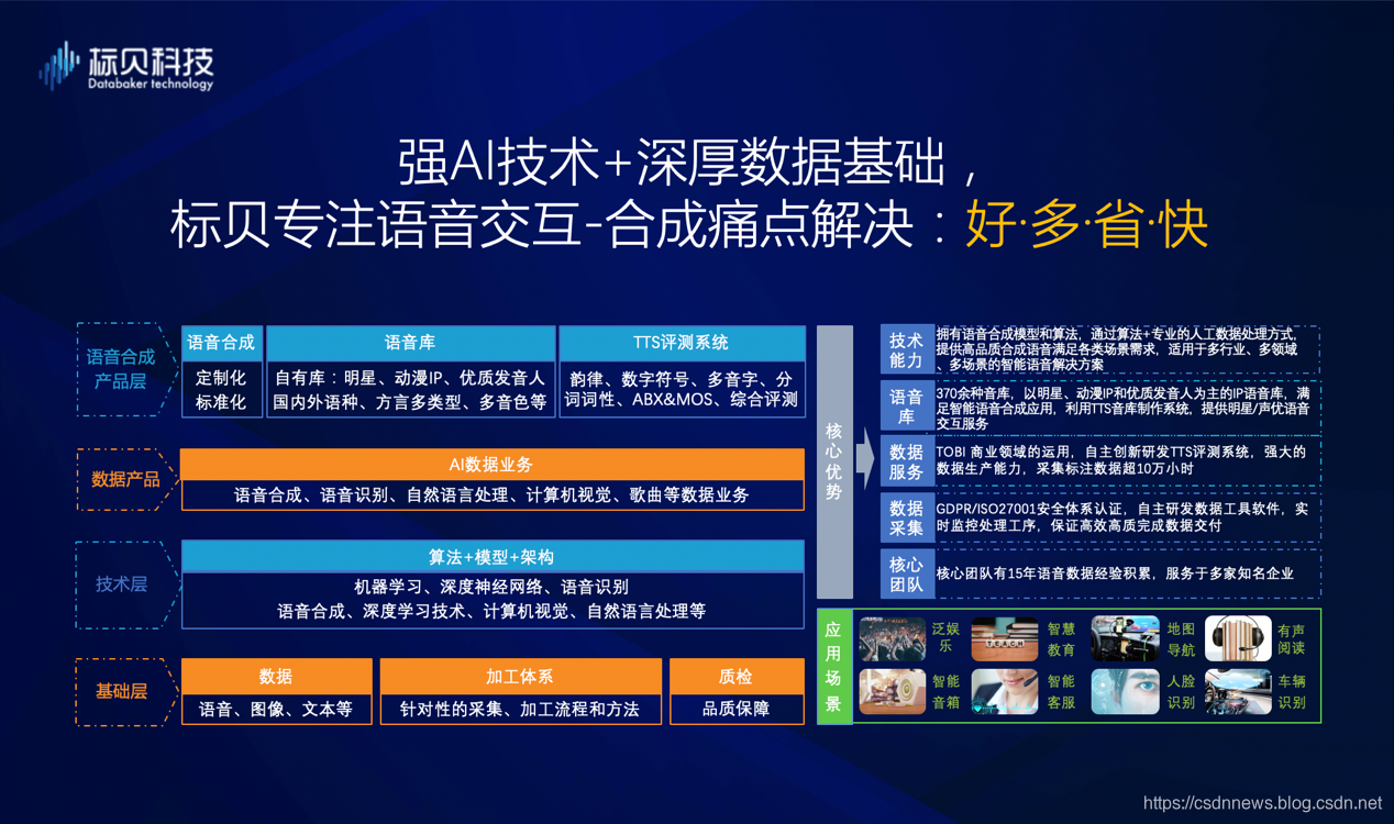 另一方面,标贝将高质量与安全放在数据服务的第一位,无论是自有语音合成方案、声音超市、语音合成评测系统方面,还是为客户提供数据业务支持。数据已深入贯穿在产品、技术的每一个环节。只有当数据基础足够扎实才能跟技术充分融合,助力AI场景的完美落地。
