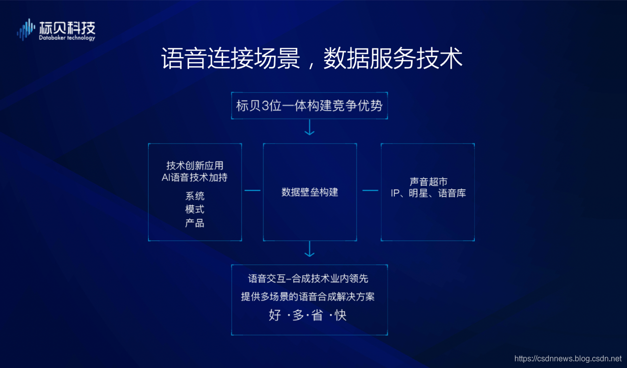 标贝科技以“语音连接场景、数据服务技术”为理念,从IP声音布局、AI技术创新、深厚的数据积累这三方面,构建自身竞争优势,做AI产业的“水电媒”,为产业赋能,提供基础设施服务。