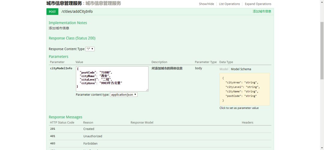 @ApiImplicitParam(name = "cityModel",value = "所添加城市的具体信息",required = true, dataType = "CityModel", paramType="body")})
