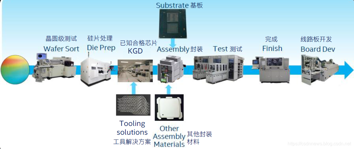 从上图中,我们不难看出,在着手封装技术伊始,首先需要对晶圆进行测试;其次根据硅片处理,即将晶圆分割成更加小的一些裸片之后,英特尔通过 KGD 工作站,基于已知合格芯片整个的工作流程,确保提交给客户所有的芯片都是质量合格的,在这一过程中,英特尔会有具体的工具解决方案,来对裸片进行测试。以上流程完结之后就是封装,英特尔会把裸片结合基板以及其他的封装材料封装于一体后进行统一的测试。此后,在完成阶段确保整个芯片包括封装都会正常运行,最终交付给客户。