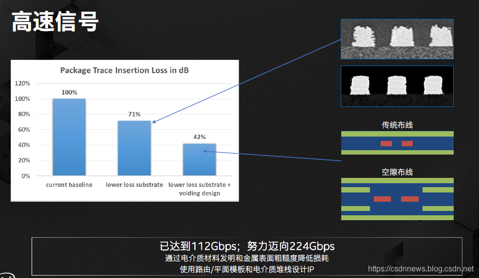 空隙布线可以更好的通过电介质堆栈的设计进一步减少两者之间信号传导的损耗。现在通过先进封装技术已经可以达到 112Gbps,但是英特尔未来希望早电介质材料上进一步进行创新、优化,以进一步改善我们的信号传递,把它达到 224 的数量级。只有这样,整个信号的高速会得到大幅优化,除此之外信号的保真度也会越来越强。
