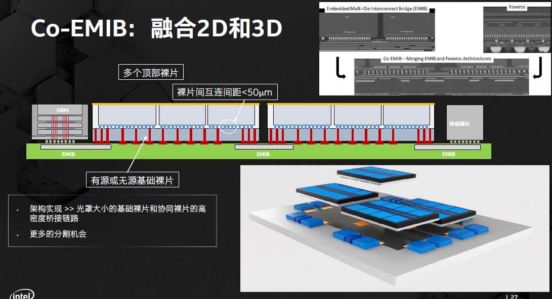 基于此,Ravi 分享了构建高密度 MCP 的三大关键基础技术——EMIB、Foveros、Co-EMIB。