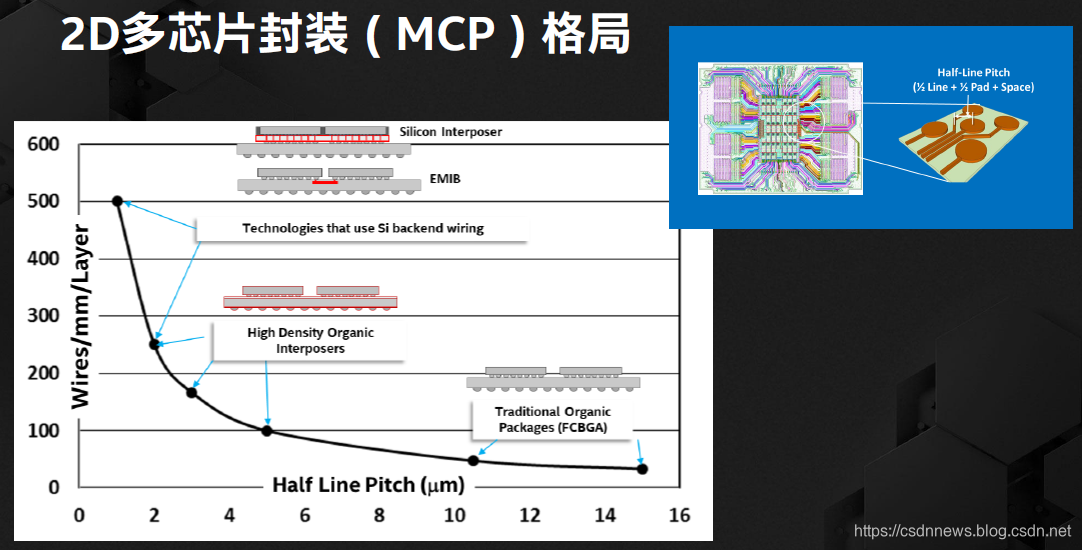 从上图可以看出,最传统的有机封装形式裸片上基本是每毫米大概会有 30 个导线;如果用传统的封装技术加上更加先进的制造技术可以把这个数字提高到 100-150;如果用硅工艺的话可以轻松地把导线数量提高到 200、400 甚至 500-600。