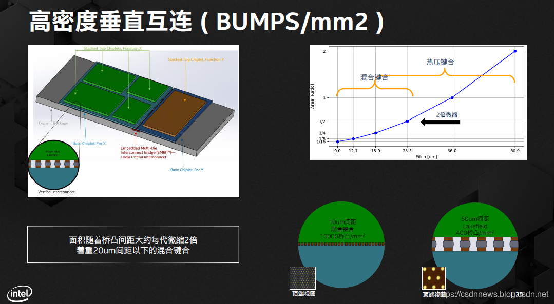 - 实现大面积拼接的全横向互连。在未来随着小芯片使用,该微缩方向会越来越普及,对此,英特尔也希望在小芯片集成当中保证更高的带宽。