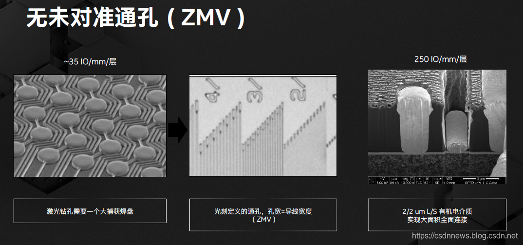 为了解决这一挑战,英特尔开发了基于光刻定义的通孔,如上图所示,导线和通孔的宽度是一致的,这样就不需要焊盘进行连接,在此情况下,就可以实现在不牺牲传导速度的情况下而做到。