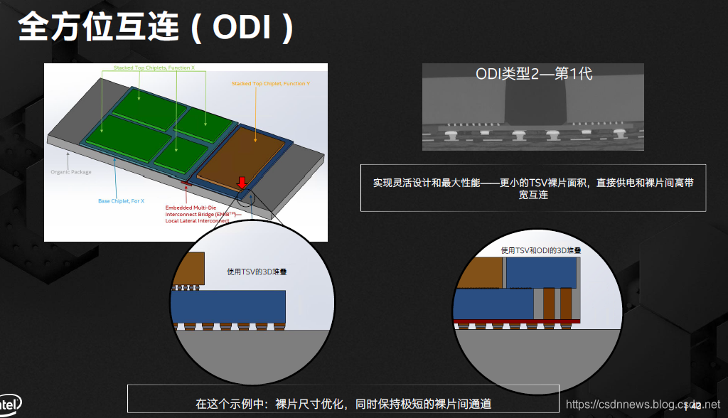 - 通过全方位互连(ODI)技术,如今的基础裸片就不用像过去那样,要比上方搭载小芯片的面积总和更大。
