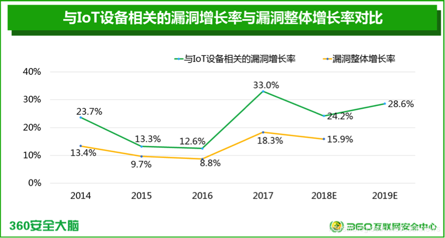 360 安全大脑根据安全大数据分析保守预测,如果不采取有效措施提高 IoT 设备安全性,2019 年,IoT 设备漏洞将以 28.6%的速度增长,安全形势不容乐观。