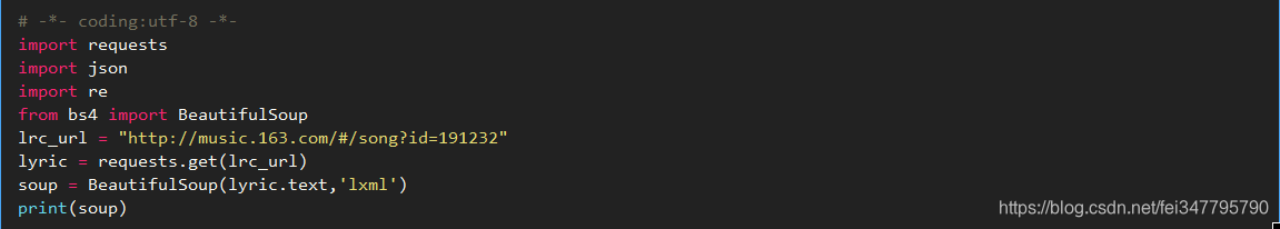 作为新手,我很本能就打开页面复制了url,然后用Beautifulsoup解析了网页并打印出来,然后去查找歌词所在的标签,心想这不是so easy吗!写下了以下代码