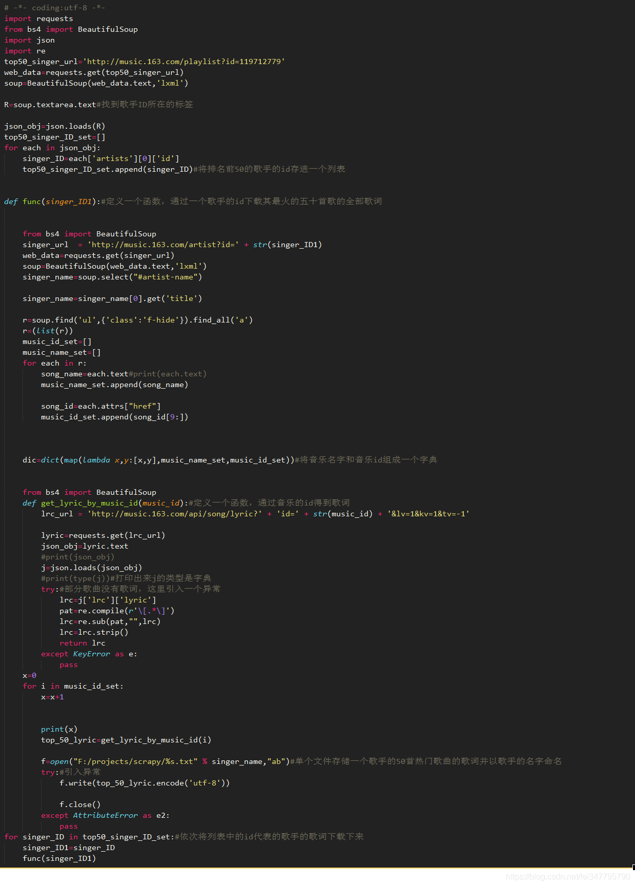 思考了一会,觉得代码没有问题啊!于是做了一个标记,可以让我看到是下载到哪个歌手的哪个歌手的哪一首歌时出了错误,机智的我终于找到了问题所在,原来是该歌曲没有提供歌词!于是又添了几行代码引入了异常机制!终于完美了!下面附上源代码及效果图