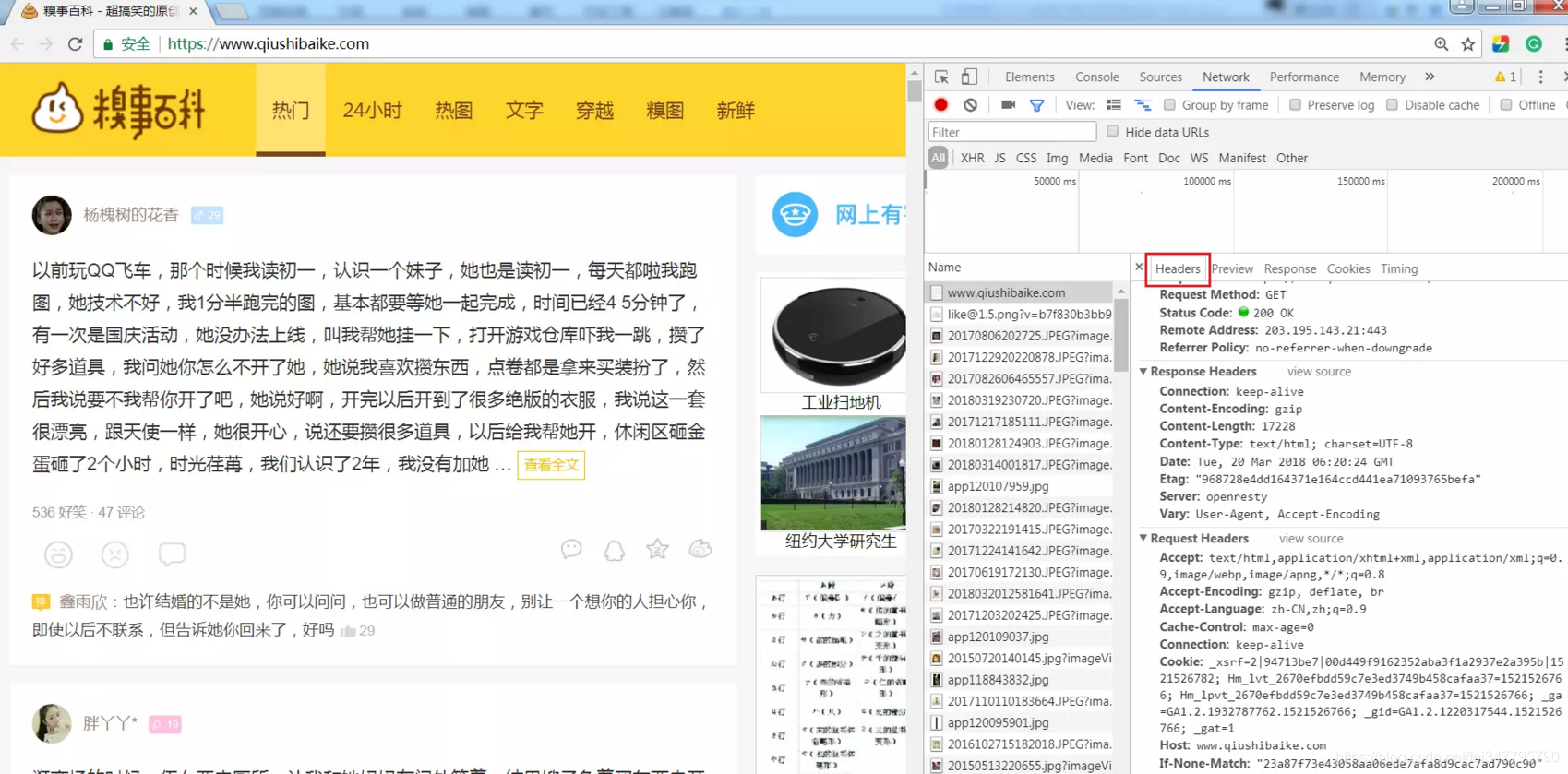 打开糗事百科页面,如下图,通过F12,找到headers,这里主要关注用户代理User-Agent字段。User-Agent代表是用什么工具访问糗事百科网站的。不同浏览器的User-Agent值是不同的。那么就可以在爬虫程序中,将其伪装成浏览器。