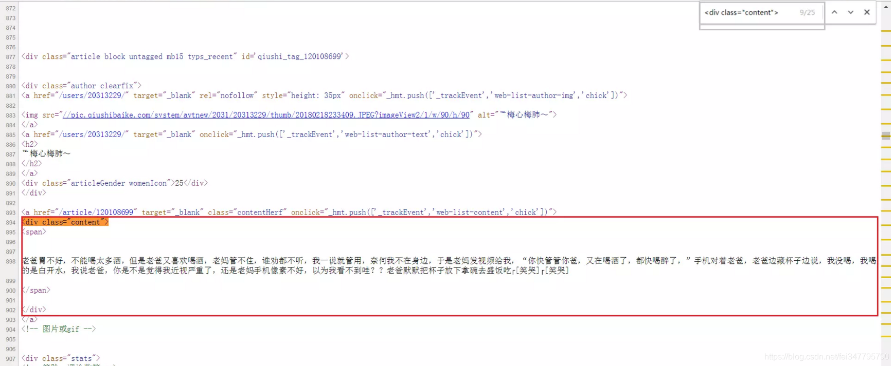 第二步,思考如何提取某个段子?查看网页代码,如下图所示,可以发现<div class="content">的数量和每页段子数量相同,可以用<div class="content">这个标识提取出每条段子信息。
