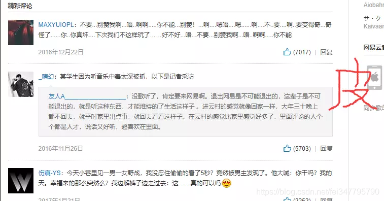 某宝评论区已经成功爬取了,jd的也是差不多的方法,说实话也没什么好玩的,我是看上它们分析简单,又没加密才拿来试手的。如果真的要看些有趣的评论的话,我会选择网易云音乐,里面汇聚了哲学家,小说家,story-teller,皮皮虾等各种人才,某些评论非常值得收藏(甚至开了一个歌单专门收藏它们)。竟然这么好玩,何不尝试把他们爬取下来呢?