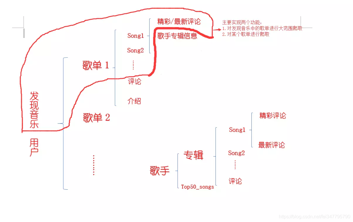 我们要爬的是歌曲的评论,而歌曲的来源有多种,有的来源于专辑,有的来源于歌单,有的来源于歌手页;而歌单和专辑的来源又有多种。所以爬取多个歌曲的评论之前,我们要分析一下信息的结构,最好写下来,这样头脑会更清晰减少代码修改量。这里放出一张我自己整理的结构,并选择一条线路来实现(发现音乐→→歌单→→歌曲→→评论)