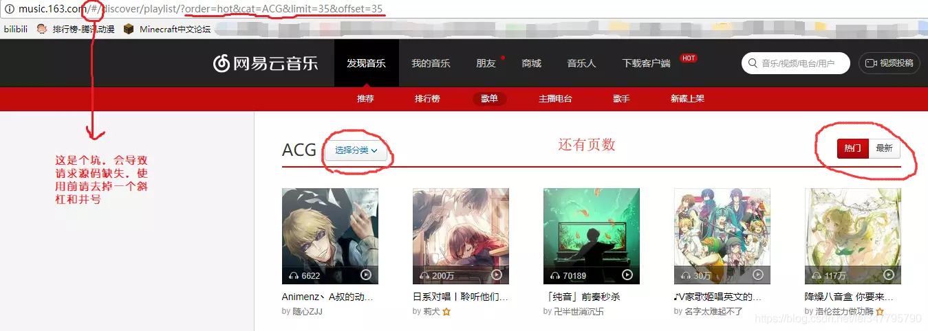 首先进入官网的“发现音乐”的“歌单”一栏,这里可以看到很多高分歌单,先到处点一下,可以发现链接是在改变的,说明部分数据不是动态加载的,可通过网页源码获得。最后发现链接有cat,order,offset,和limit四个对我们有用的参数,cat是分类,order是排序,offset=(页数-1)*35,limit=35。还有注意使用前要把链接的井号和一个斜杠去掉,否者会导致网页源码缺失。
