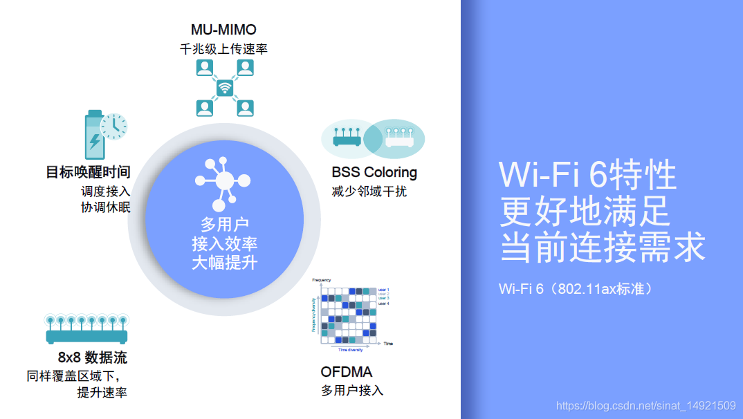 与 WiFi 5 采用的 OFDM(正交频分复用技术)不同,Wi-Fi 6 使用了 OFDMA(正交频分多址)的技术,这样的好处是让无线信道划分为多个子信道,形成一个个频率资源块,用户数据可以承载其中,这样在不占用整个信道的情况下,实现在每个时间段内多个用户同时并行传输。